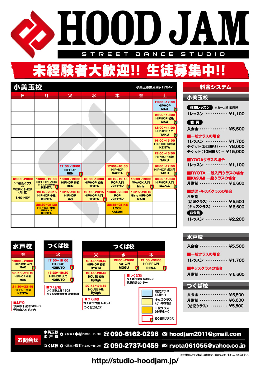 HOOD JAMのレッスンスケジュール一覧です。